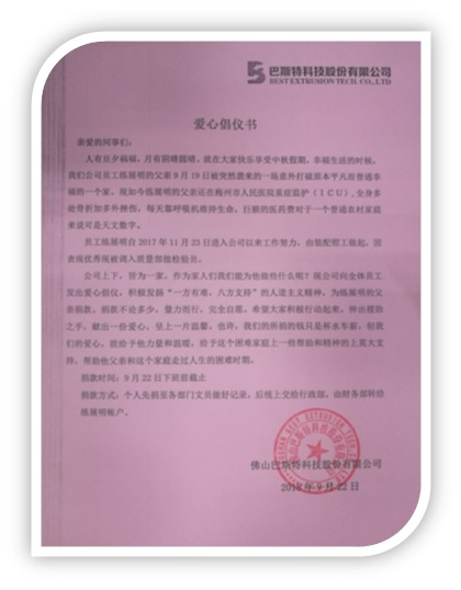 巴斯特是個溫暖的大家庭,每位員工都是其中的一員,讓員工真切感受到家的氛圍和兄弟姐妹般的關(guān)心,希望練展明的父親早日康復(fù)!